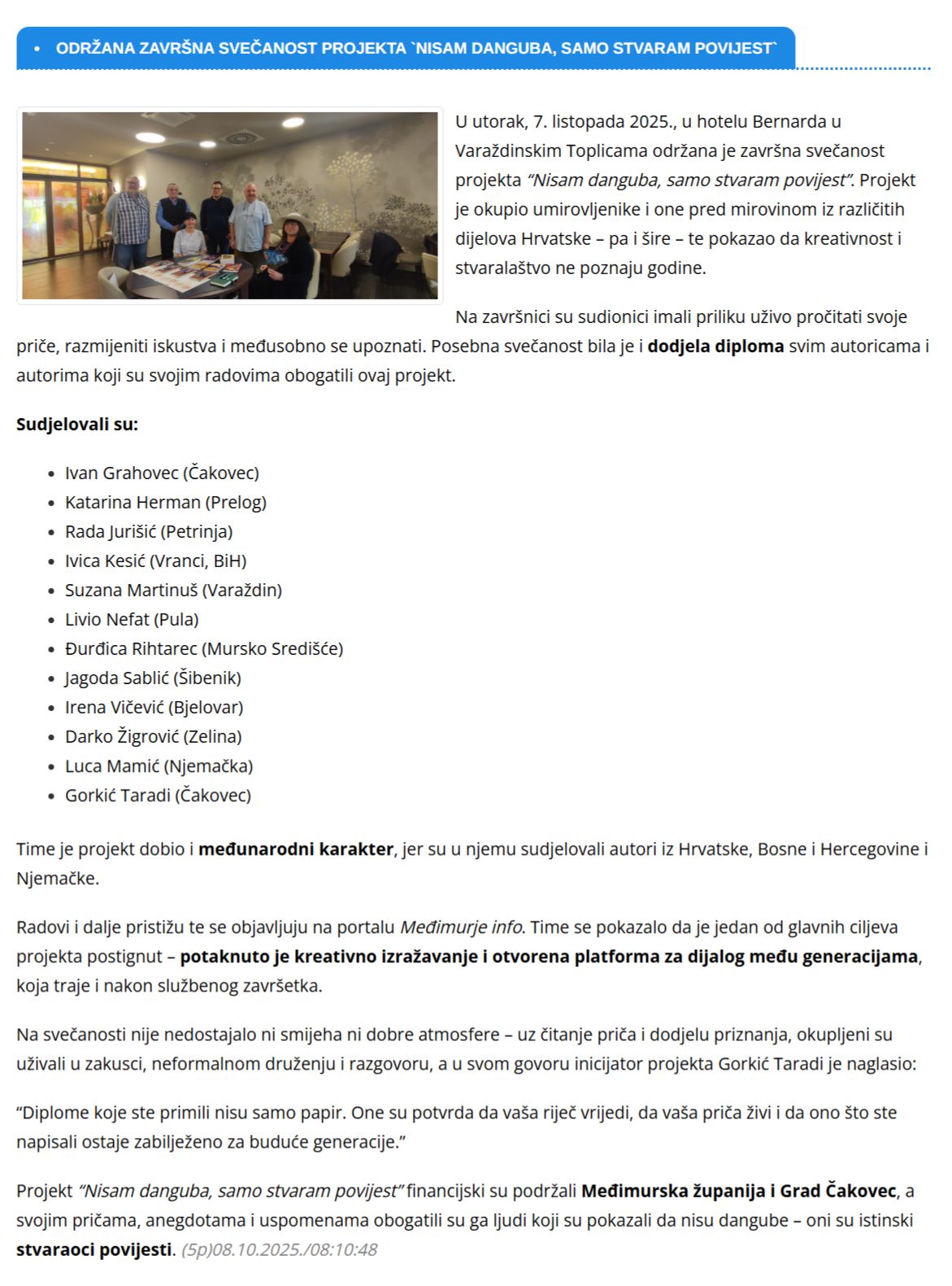 Mediji o udruzi Mlada pera 5Portal Labin: Održana završna svečanost projekta `Nisam danguba, samo stvaram povijest` 9. listopada 2025. gtaradi 32 Views https://5portal.hr/vijesti_detalj.php?id=55355 Održana završna svečanost projekta `Nisam danguba, samo stvaram povijest`
